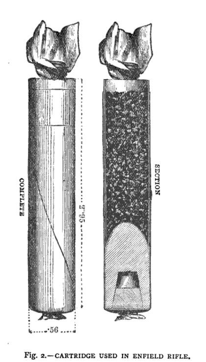 voir ici ce à quoi ça ressemble). Le papier de la cartouche était lubrifié au niveau de la balle (en plongeant simplement l'extrémité de la cartouche dans la graisse fondue). Après avoir vidé la poudre, les soldats inséraient toute la cartouche dans le canon, arrachaient d'un coup sec le papier qui dépasse, et jouaient de la baguette pour amener la balle au fond.